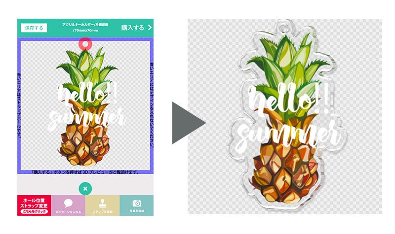 お客様がお作り頂いたデザインがシミュレーター上で立体になってご確認頂けます。正面・側面・裏面などご確認頂けます。作っても楽しいFreeカットのアクキー作成サービスです。