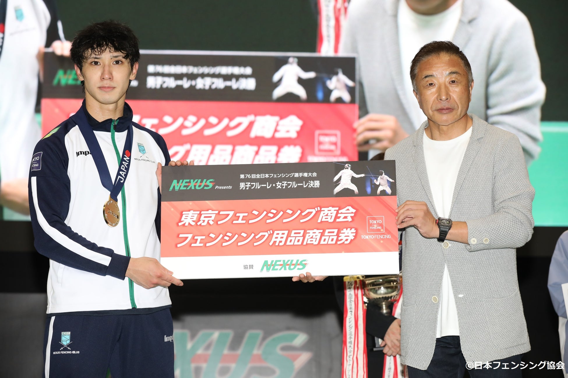 舩本選手は、普段 NEXUS FENCING CLUB(東京都練馬区)のコーチとして、ジュニアからシニアまで指導を担当しています。決勝には、当クラブのキッズたちも応援に駆け付け、NEXUS所属選手たちに声援を送ってくれました。また表彰式では プレゼンター として、NEXUSグループ代表 星野敏 より、表彰状・トロフィー・目録 他を各選手に贈呈させて頂きました。