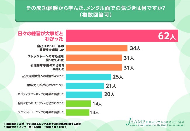 次に「その成功経験から学んだ、メンタル面での気づきは何ですか?(複数回答可)」で最も多かった回答は「日々の練習が大事だとわかった」(62人)で、メンタル面の成功にも継続的な努力が不可欠であることが強く認識されています。