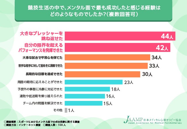 初めに「競技生活の中で、メンタル面で最も成功したと感じる経験はどのようなものでしたか?(複数回答可)」と質問したところ、最も多かった回答は「大きなプレッシャーを跳ね返せた」(44人)で、多くのスポーツ経験者が、大きな重圧下でも精神的な強さを発揮できたことを成功体験として捉えていることがわかりました。