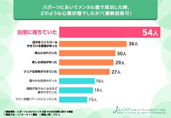 日本メディカル心理セラピー協会(本社所在地:東京都墨田区)は、スポーツ経験がある全国20〜60代の男女100名を対象に、「スポーツにおけるメンタル面での成功体験」に関する調査を実施しました。