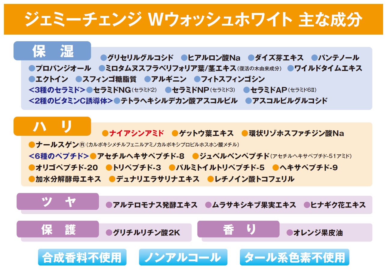 注目の保湿成分「ナイアシンアミド」を新配合し、ハリ・潤い感がアップした『Wウォッシュホワイト』。