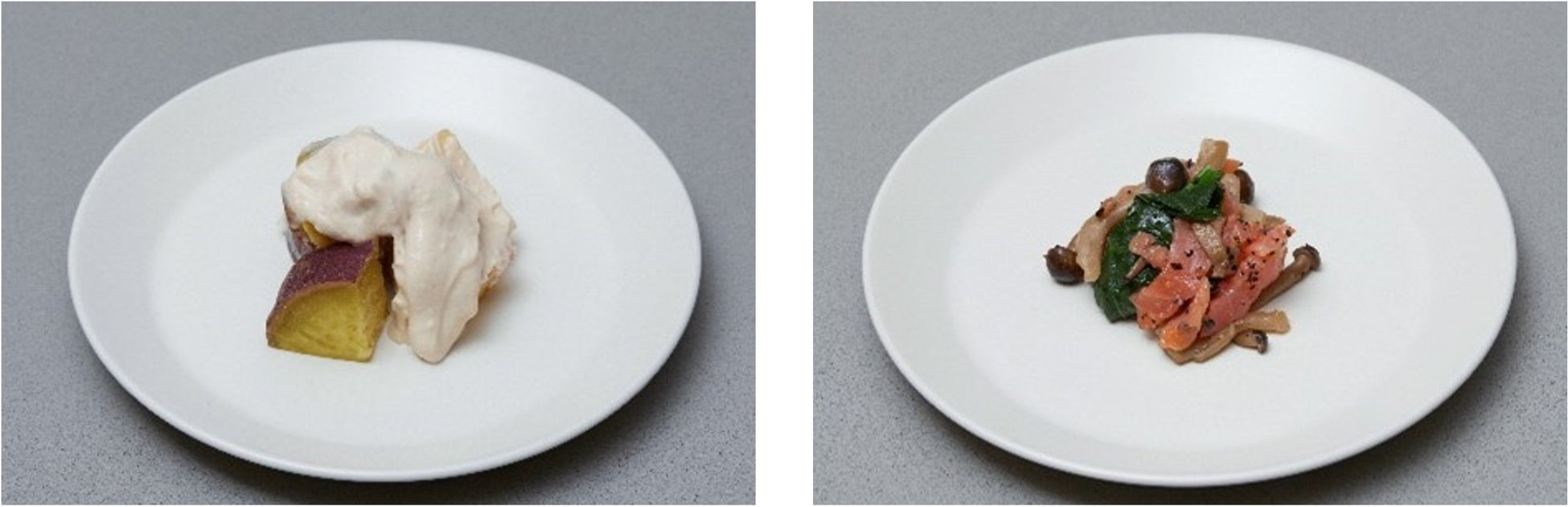 (右)かぼちゃとベーコンの豆乳クリーム添え