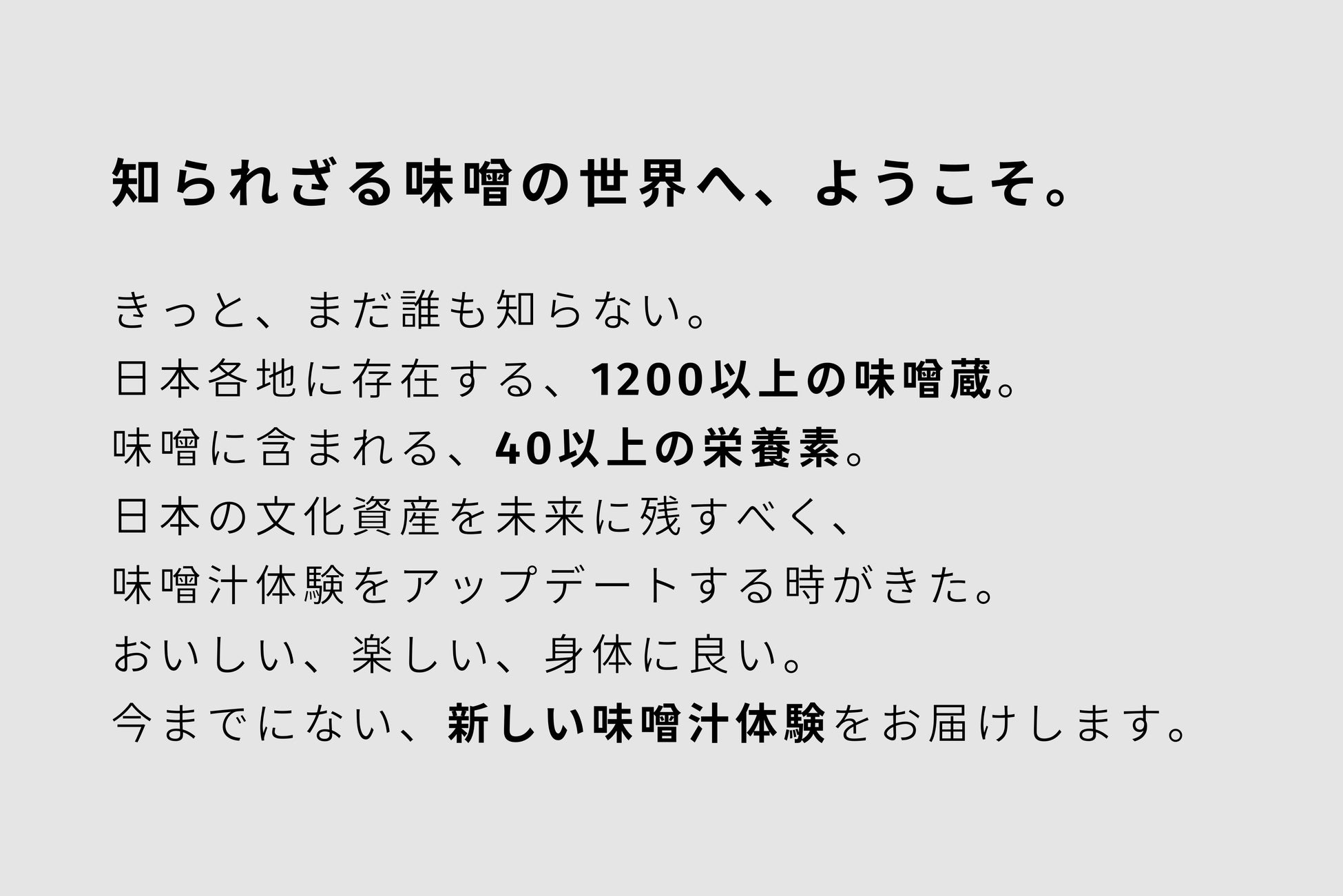 コンセプトは「新しい味噌汁体験」。知られざる味噌の地域多様性や機能性にきっと誰もが驚くはず。既存の味噌汁の固定概念を覆したい、という想いで味噌ソムリエと栄養士が厳選した、おいしく高品質なフリーズドライ味噌汁をお届けします。