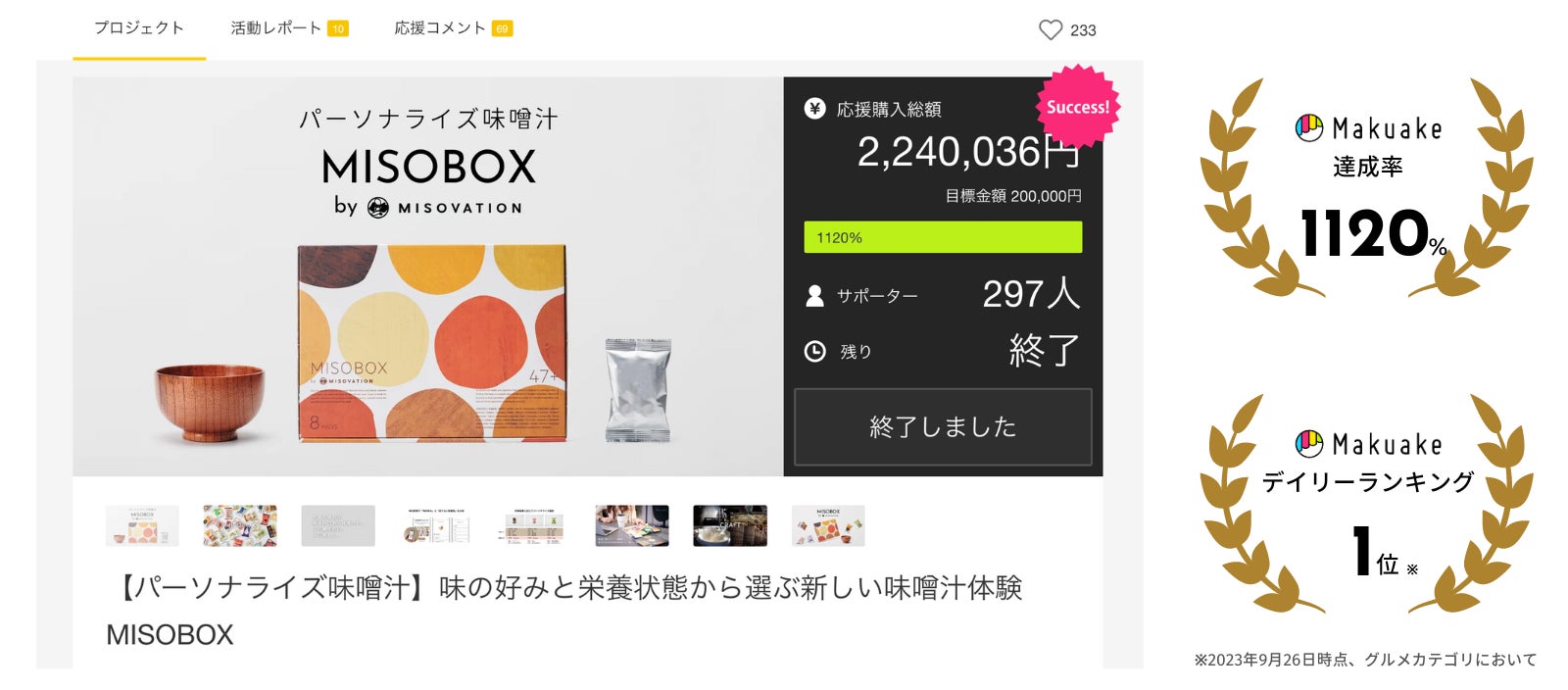 約3週間が経過した時点で累計販売数4,000食を突破。最終的な応援購入額224万円、応援購入者数297人、目標達成率1120%を達成しました。