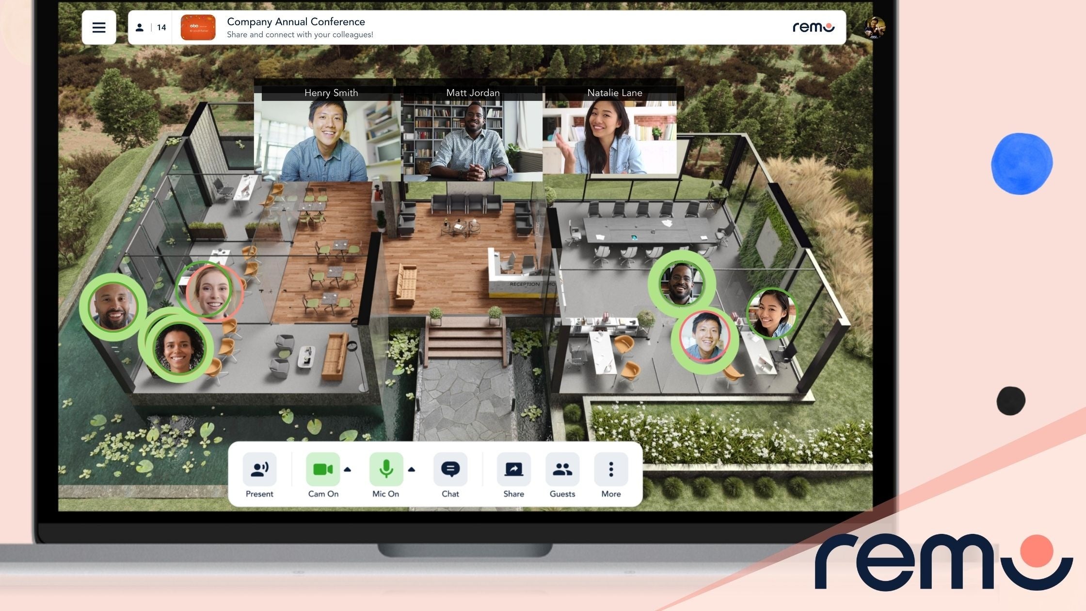 Remoのバーチャル空間は、見取り図のような会場レイアウトで構成されており、会場内の各テーブルごとにビデオ会議、チャット、ホワイトボード等を使って、他の参加者と交流することができます。Zoom連携も可能なRemoの利用には、専用アプリ等のインストールは不要。ブラウザ上での利用となり、パソコンもしくはモバイル端末一つで簡単に使うことができます。Remoは、バーチャル空間のオフィス、オンライン教室、展示会、学会、オープンキャンパス、就職フェア、ポスターセッション、セミナー、懇親会、新入社員研修等、ありとあらゆる用途で世界中の様々なシーンで使われています。