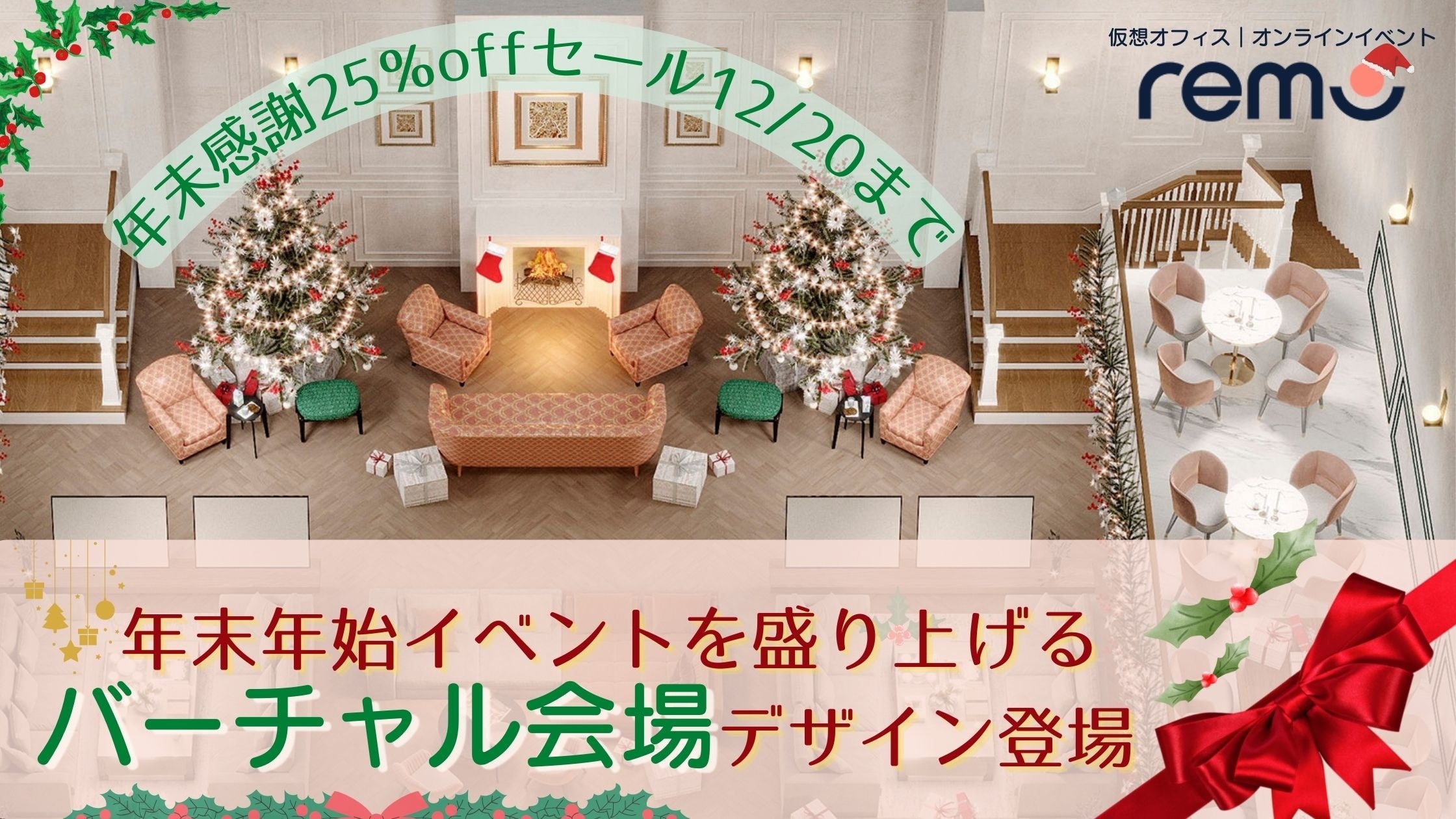 オンラインイベントや仮想オフィスの総合プラットフォーム「Remo」に関し、リモ・ジャパン合同会社(本社:東京都中央区、代表取締役:ホーイン チェン)は、過去最大規模のウインターセールイベントとなる「年末感謝セール 2022」の開催を発表しました。本日2022年12月5日(月)開始となる本イベント期間中は、25%オフで、Remoの有料プランの購入が可能となります。