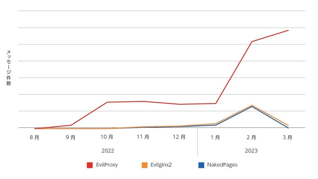 市販のMFAバイパスフィッシングキットがアンダーグラウンドで公開されたことにより、技術力のない犯罪者でもフィッシングキャンペーンを展開することが可能に: EvilProxy、Evilginx2、NakedPagesなどのMFAバイパス構造は、1ヶ月あたり100万件以上のフィッシングメッセージを記録しています。