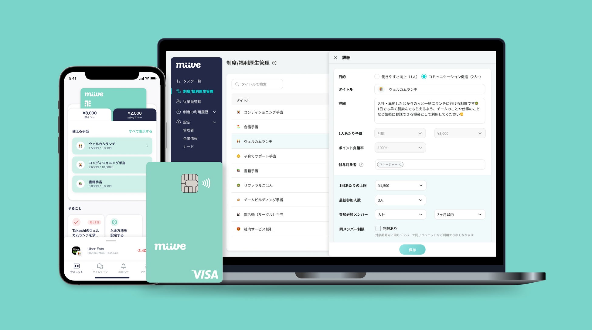 miiveは、アプリとVISAのプリペイドカードを活用し、全国でご利用いただける福利厚生/制度運用プラットフォームです。新卒・中途採用の差別化や従業員の帰属意識向上、拠点格差のない福利厚生の実現など、さまざまな課題に対応しています。従業員の利用率は90%を超え、制度運用者様は利用状況を管理画面上でリアルタイムで把握できる等、双方の課題解決に貢献しています。