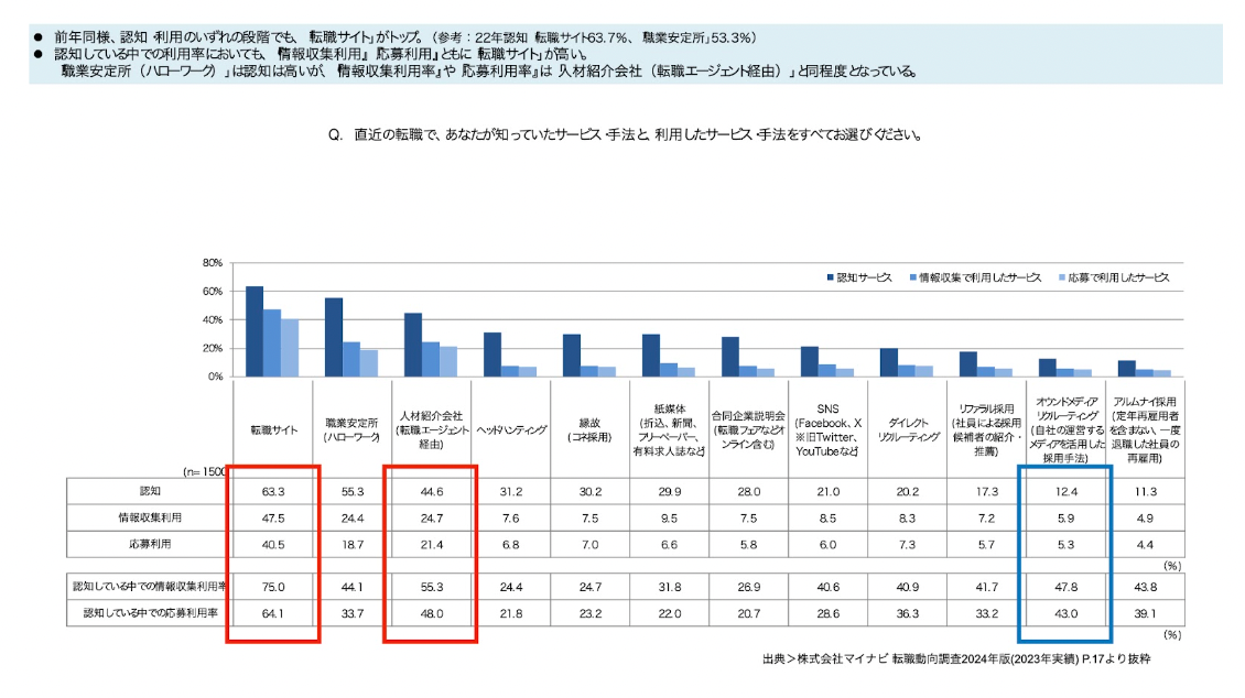 株式会社マイナビ「転職動向調査2024年版(2023年実績)」によると、転職者が利用する転職時の応募利用割合は、「転職サイト」や「人材紹介会社」が7割以上を占めています。一方で、採用企業が独自で展開する「オウンドメディアリクルーティング」は、5.9%と利用率が低いことがわかります。