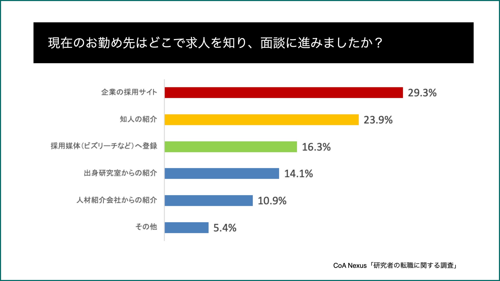 ◼︎採用媒体から情報を得ているケースが、一般的な職種の転職よりも低く、研究者の職業に関しての情報が充実している採用媒体が少ないことや、それに伴い、研究者たちの期待値の低さから、3番目に位置していると推察されます。