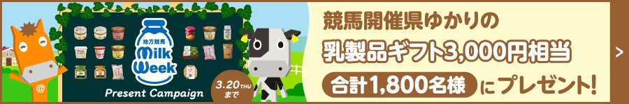 特設サイトから動画を視聴後アンケートに回答して応募すると抽選で総計1,800名様に競馬開催県ゆかりの乳製品ギフトが当たるキャンペーンを実施します。