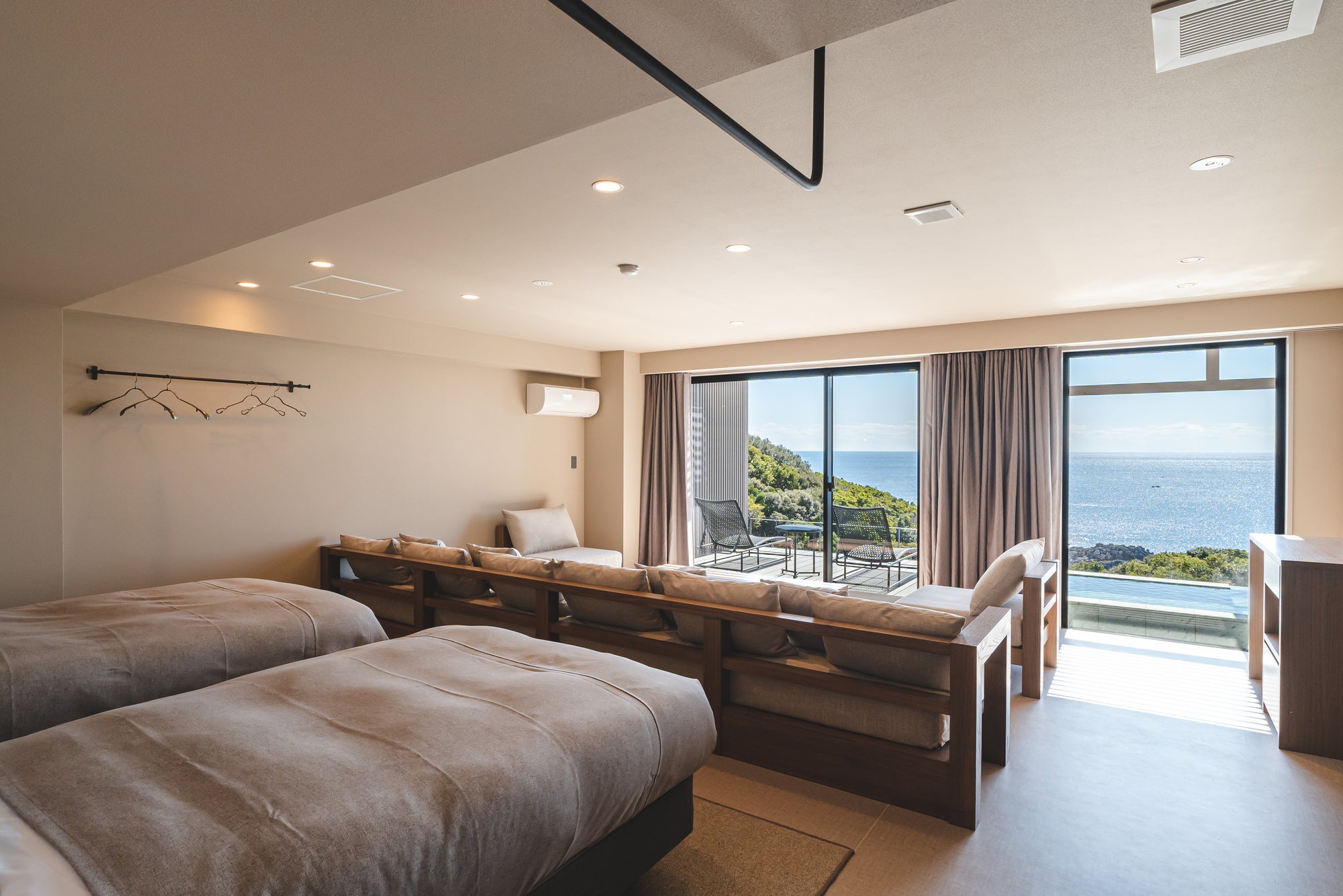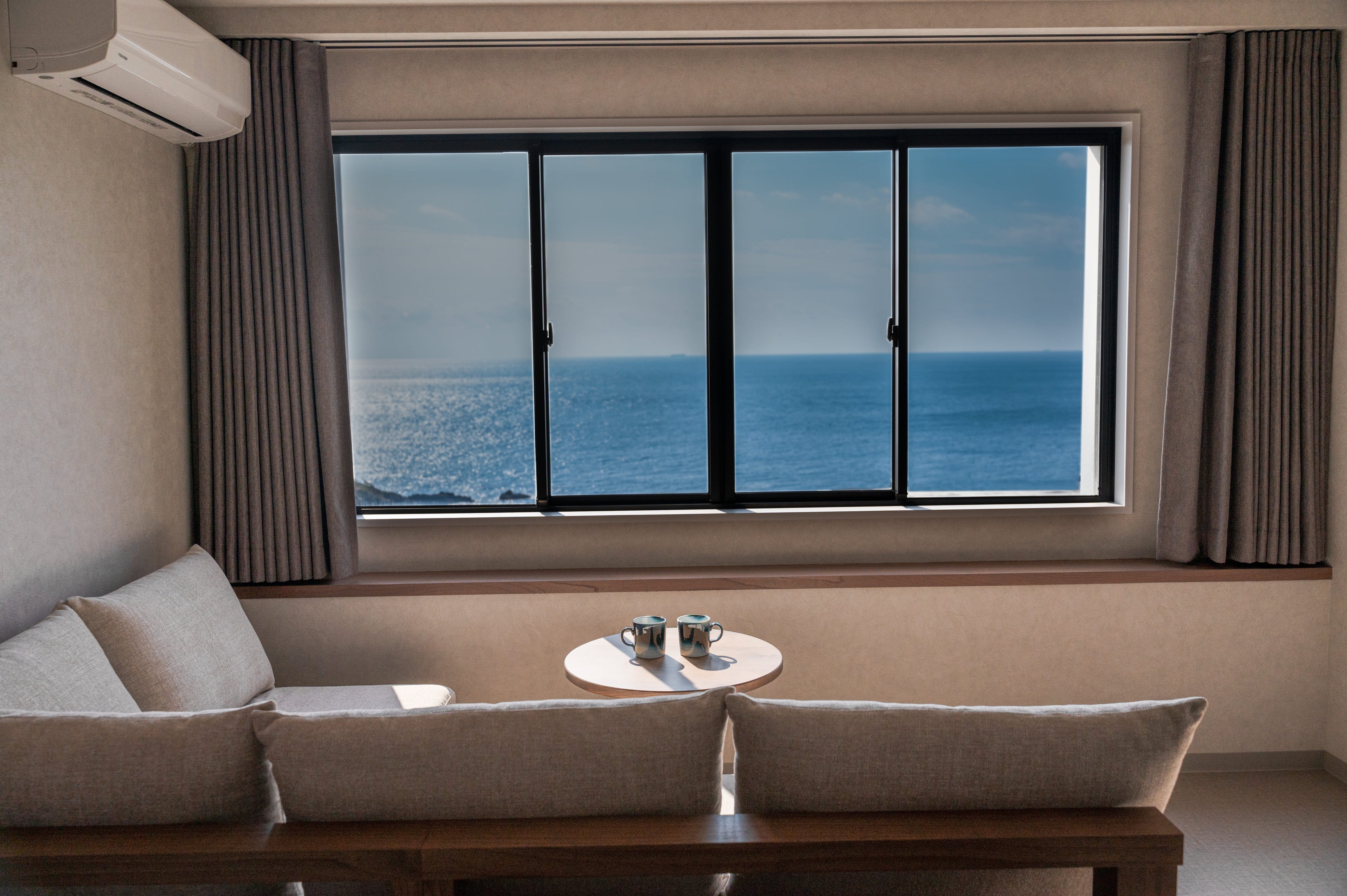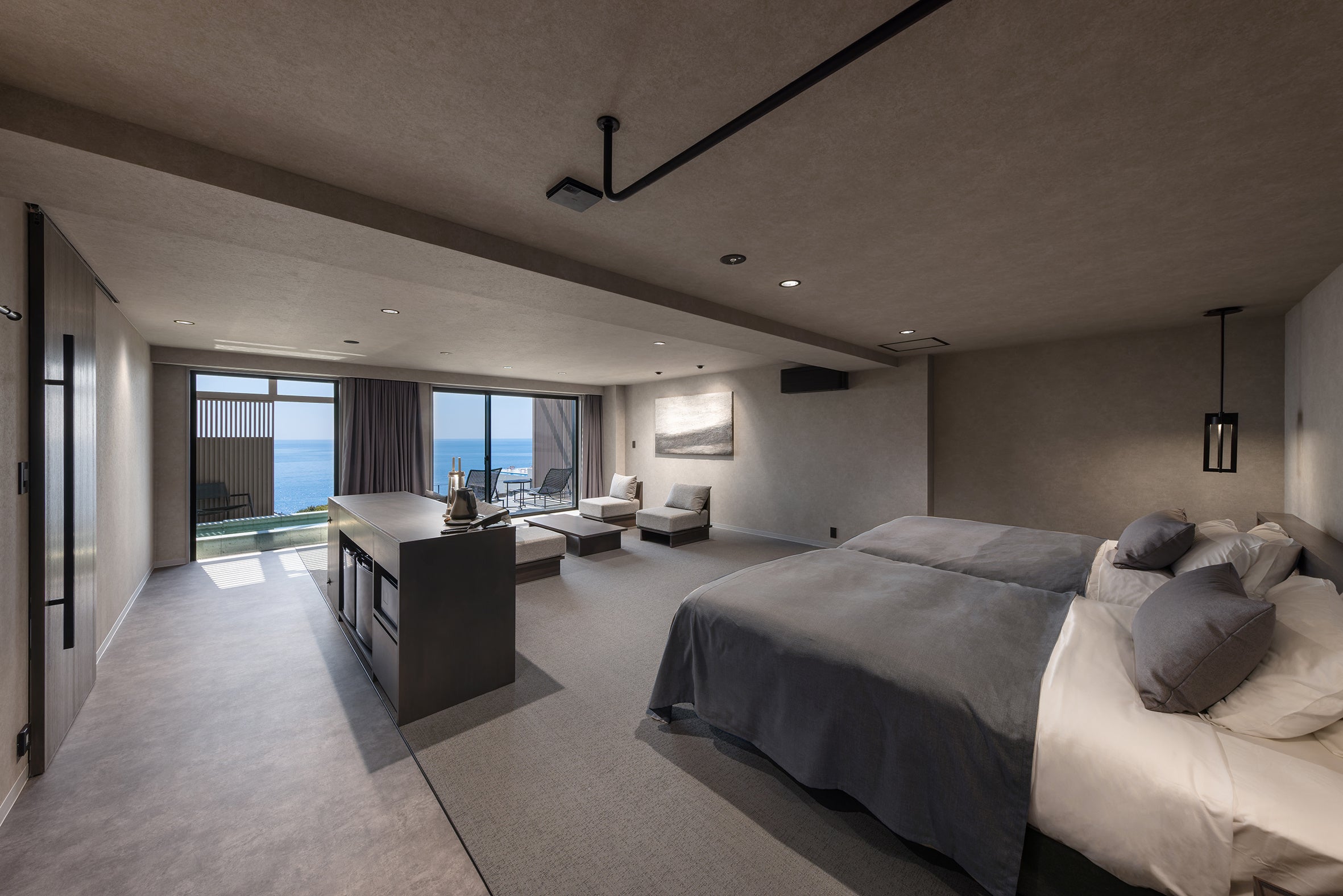また、目の前に広がる圧倒的な海景を一番にご堪能いただきたく、窓の外に広がる色鮮やかな自然の色合いを邪魔することのないよう、室内は落ち着いた色合いで統一しています。