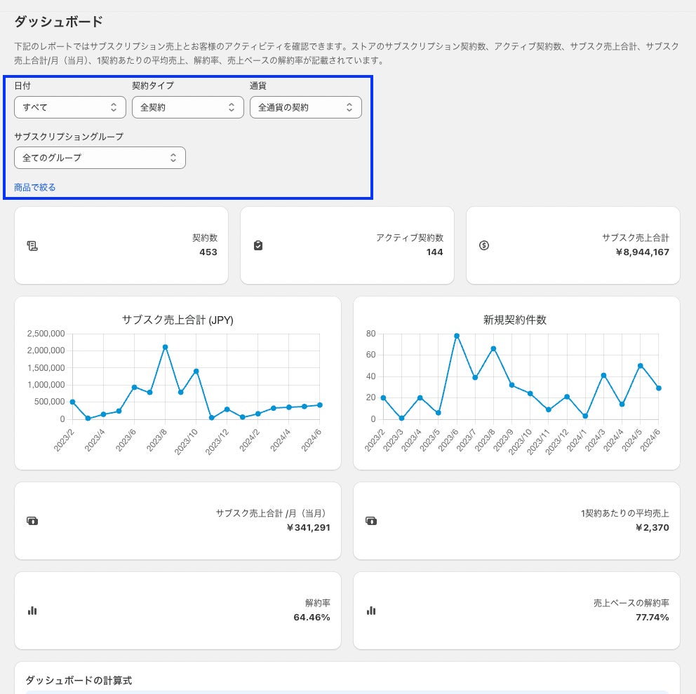 ダッシュボードでデータを商品、サブスクリプショングループ、サブスクリプションプラン、通貨、テスト契約で絞り込みができるようになりました!