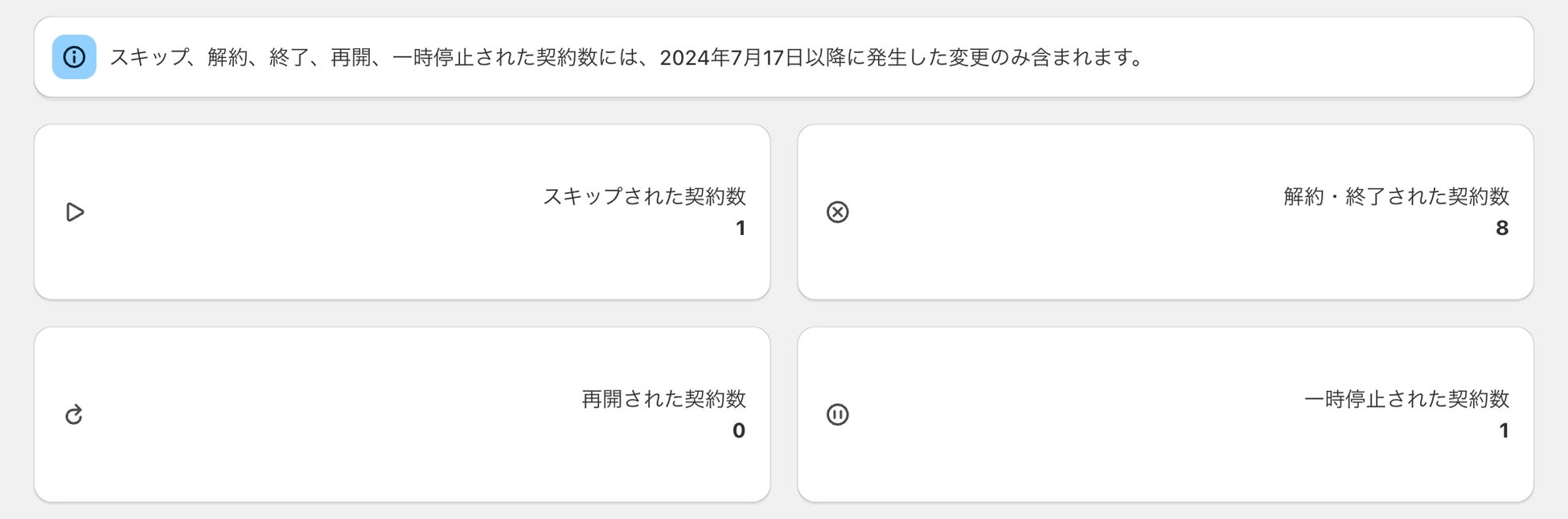 契約のスキップ、一時停止、終了、解約、再開された契約数