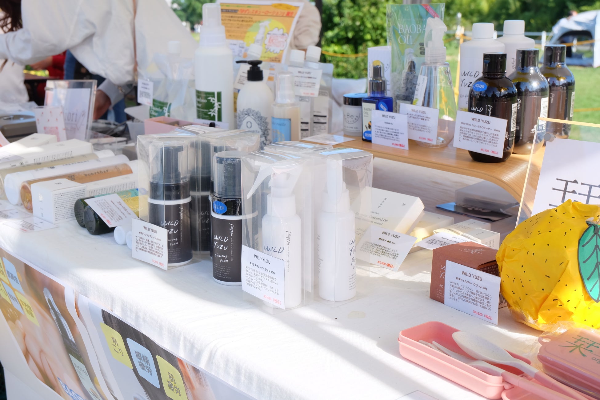 約30店舗のブースが立ち並ぶ中、『栞〜siori〜』は大阪・箕面の実生ゆずを原料としたスキンケア商品をはじめ、身体にも地球にも優しい商品を販売するとともに、お子様から大人まで楽しめる体験型のハンドメイドワークショップも開催。