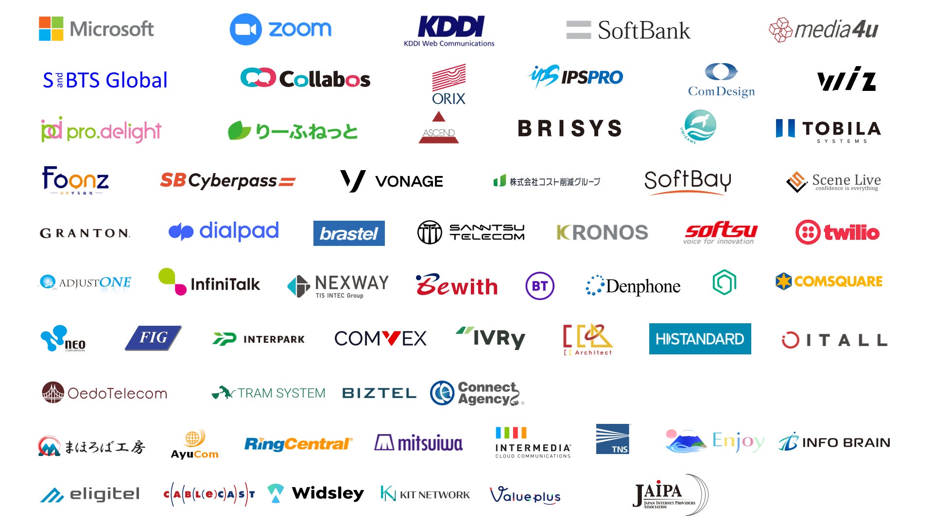 会 員: 株式会社まほろば工房・株式会社プロディライト・ブラステル株式会社・株式会社りーふねっと・株式会社三通テレコムサービス・株式会社グラントン・株式会社クロノス・株式会社リンク・株式会社ソフツー・有限会社アユコム・リングセントラルジャパン株式会社・ミツイワ株式会社・Twilio Japan合同会社・株式会社アセンド・Dialpad Japan株式会社・株式会社アジャストワン・ブライシス株式会社・Zoom Video Communications Inc.・ジェイエムエス・ユナイテッド株式会社・インターメディア・テクノロジーズ・ジャパン合同会社・株式会社KDDIウェブコミュニケーションズ・ソフトバンク株式会社・株式会社ネクスウェイ・ビーウィズ株式会社・株式会社メディア4u・株式会社Enjoy・S and BTS Global株式会社・株式会社ウミガメ・BTジャパン株式会社・デンフォン株式会社・Cloopen株式会社・トビラシステムズ株式会社・Foonz株式会社・株式会社コムスクエア・エスビーサイバーパス株式会社・株式会社コラボス・株式会社NEOコーポレーション・インフォブレイン株式会社・株式会社Eligitel・Vonage Japan合同会社・株式会社コスト削減グループ・株式会社SoftBay・ジャパンケーブルキャスト株式会社・オリックス株式会社・株式会社アイ・ピー・エス・プロ・株式会社コムデザイン・ファイン・インテリジェンス・グループ株式会社・株式会社Widsley・株式会社KITネットワーク・株式会社インターパーク・株式会社バリュープラス・株式会社コンベックス・株式会社IVRy・株式会社SceneLive・トラムシステム株式会社・日本ティー・エヌ・エス株式会社・株式会社Wiz・株式会社ハイスタンダード・CCアーキテクト株式会社・アイティオール株式会社・大江戸テレコム株式会社・株式会社コネクトエージェンシー(2024年4月1日現在)