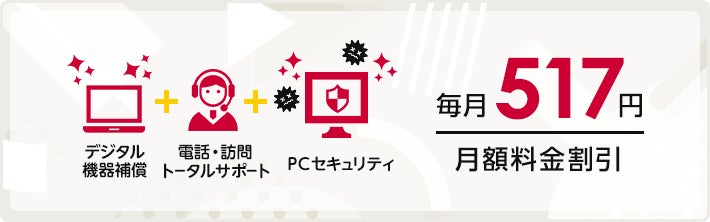 あんしんパック ホームは、「ネットトータルサポート」「ネットワークセキュリティ」「デジタル機器補償サービス」をお申込みいただくと、月額料金合計から517円引きでご利用になれるサービスです。