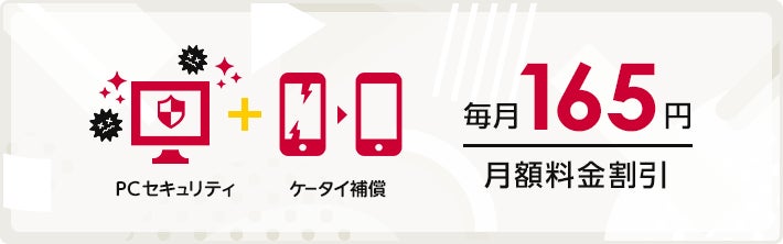 故障・水濡れなどのあらゆるトラブルを補償する「ケータイ補償サービス」と、パソコン向けセキュリティ対策機能を提供する「ネットワークセキュリティ」をセットでお申込みいただくことで、月額料金合計から165円を割引くサービスです。