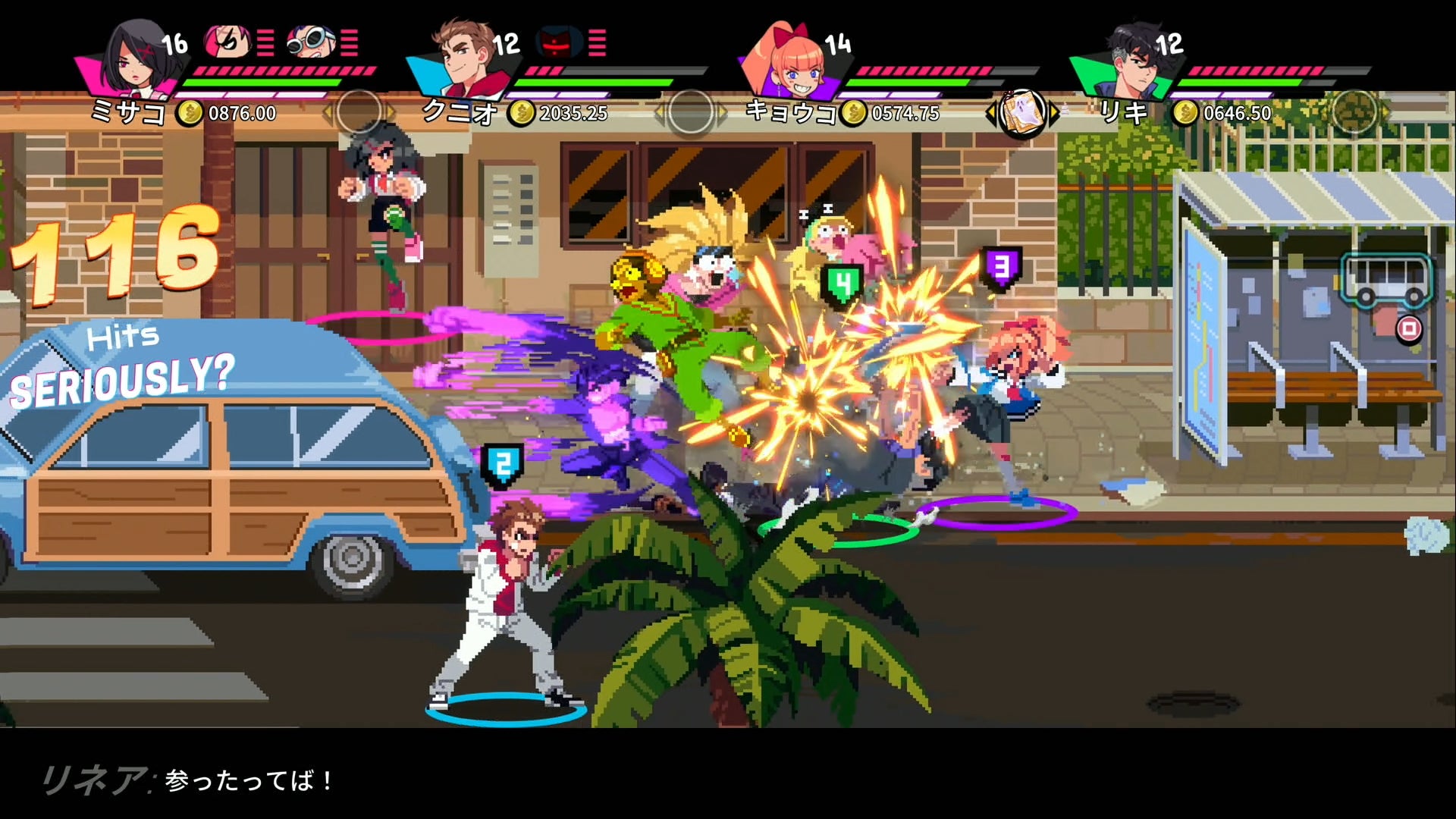 大人気アクションゲーム「くにおくんシリーズ」のスピンオフタイトル『リバーシティガールズ』がさらにパワーアップして帰ってきました。本シリーズは「クニオ」と「リキ」の(自称)彼女である「ミサコ」と「キョウコ」たちが、次々と襲いかかる不良たちをなぎ倒していく、おなじみのベルトスクロールアクションゲームです。