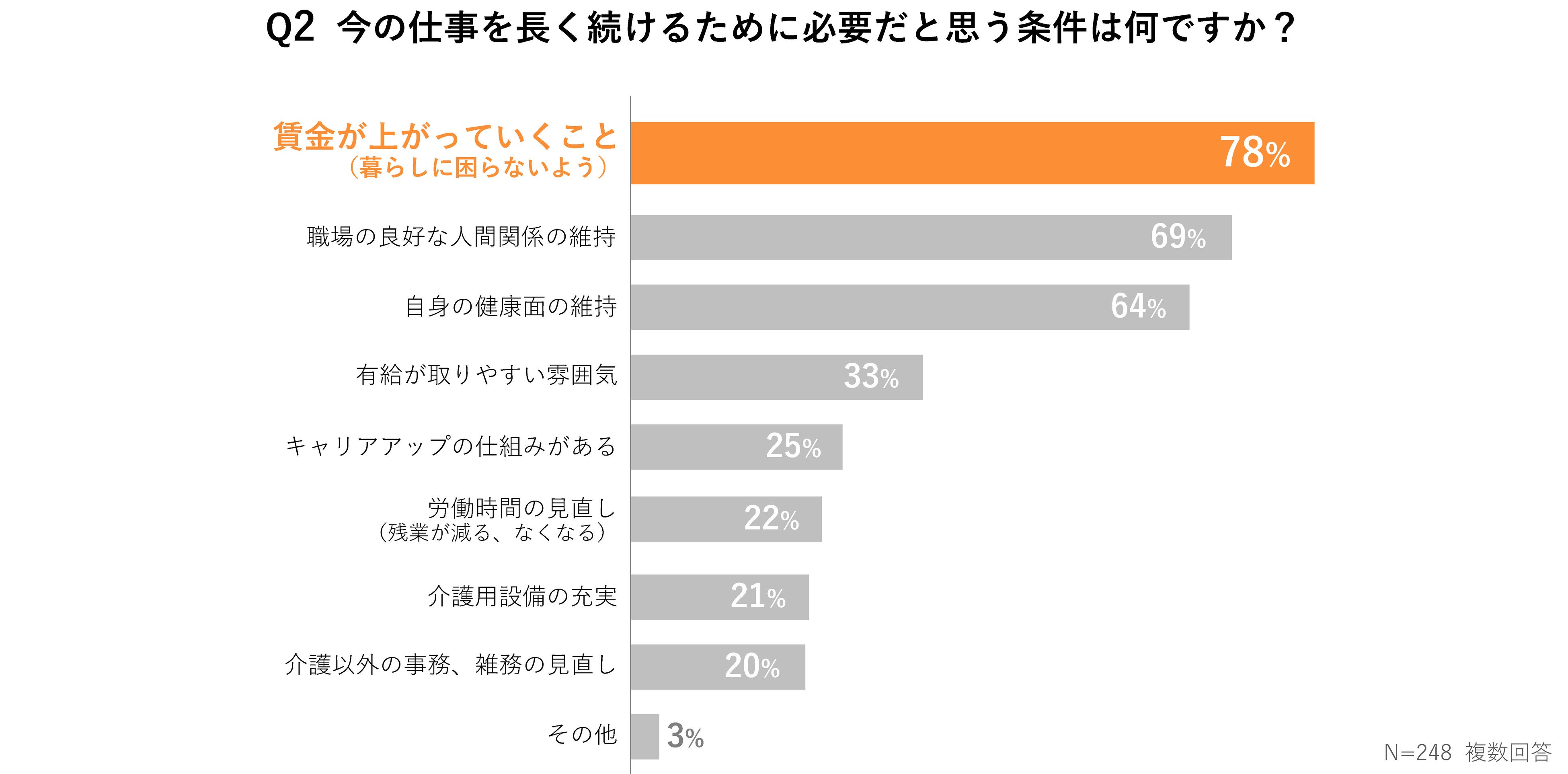 次に、「今の仕事を長く続けるために必要だと思う条件は何ですか?」と質問したところ、「賃金が上がっていくこと(暮らしに困らないよう)」が78%で1位となりました。「職場の良好な人間関係の維持」、「自身の健康面の維持」などの回答も上位にあがりました。