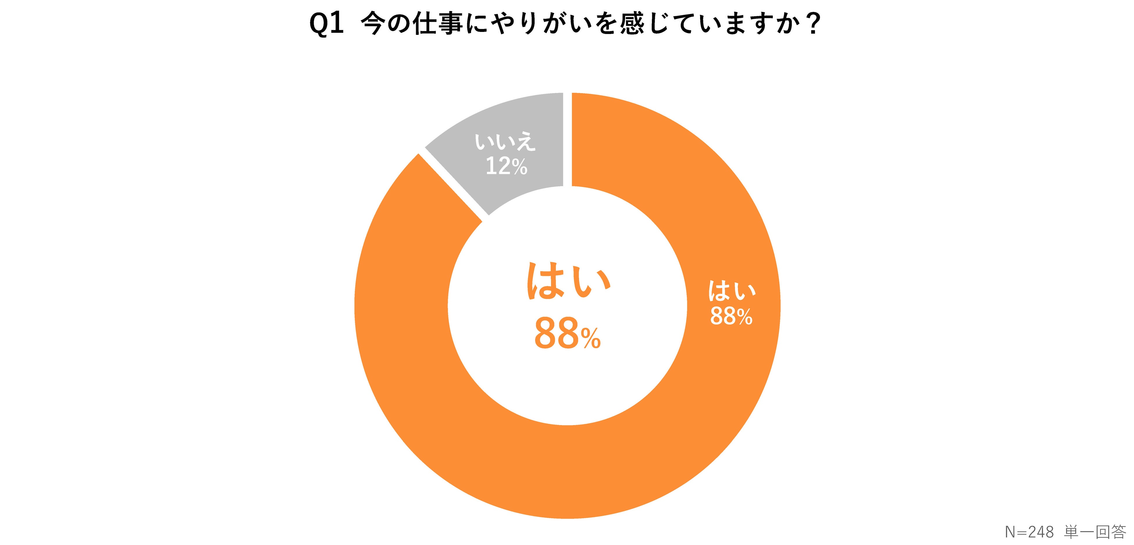 「今の仕事にやりがいを感じていますか?」と質問したところ、88%の人がやりがいを感じていると回答しました。