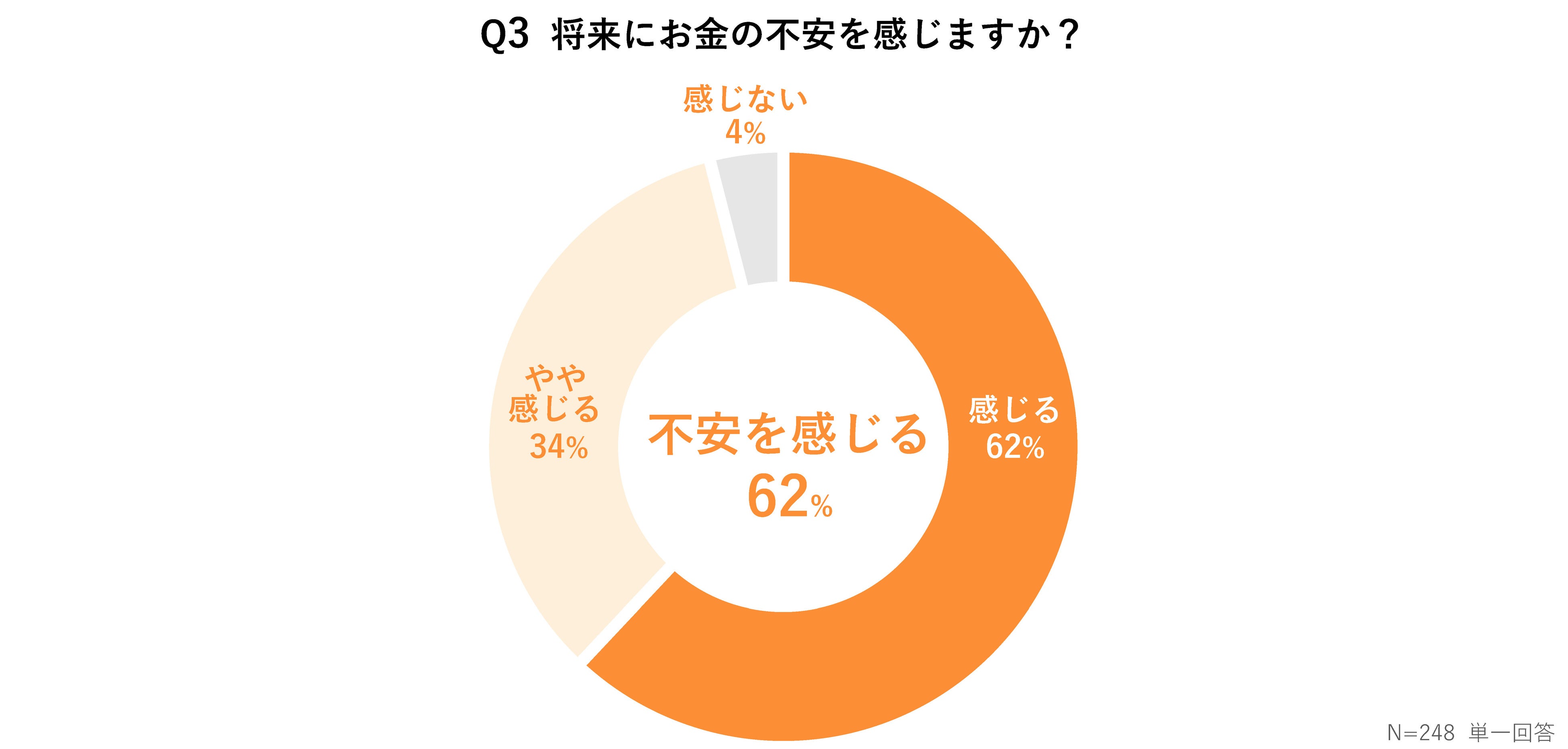 「将来にお金の不安を感じますか?」と質問したところ、「感じる62%」、「やや感じる34%」という結果となり、計96%が、将来のお金について不安を抱えていることが分かりました。