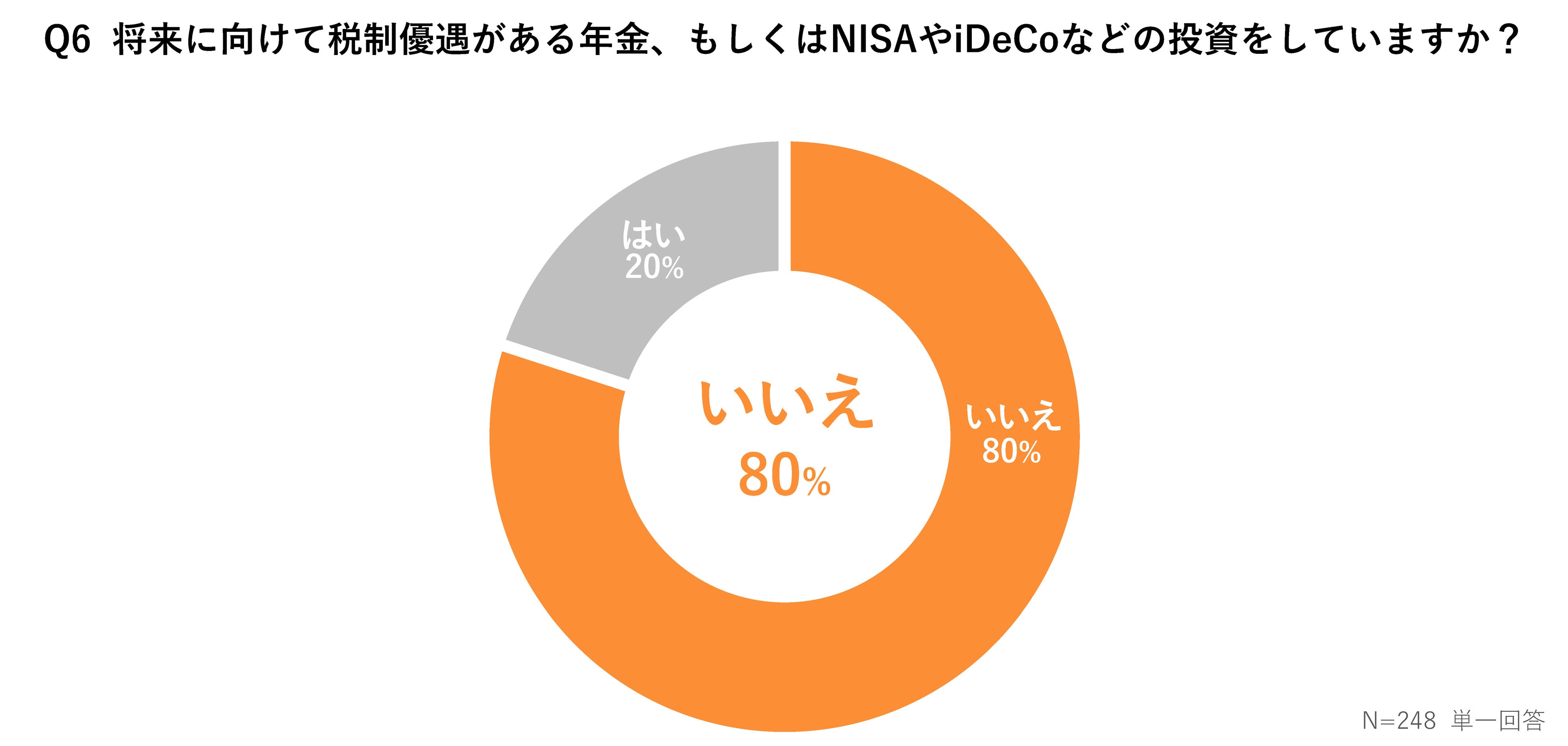 「将来に向けて、税制優遇がある年金、もしくはNISAやiDeCoなどの投資をしていますか?」と質問したところ、「いいえ」と答えた人が80%と、ほとんどの人が将来の資産形成に有益な積立を行っていないことが分かりました。