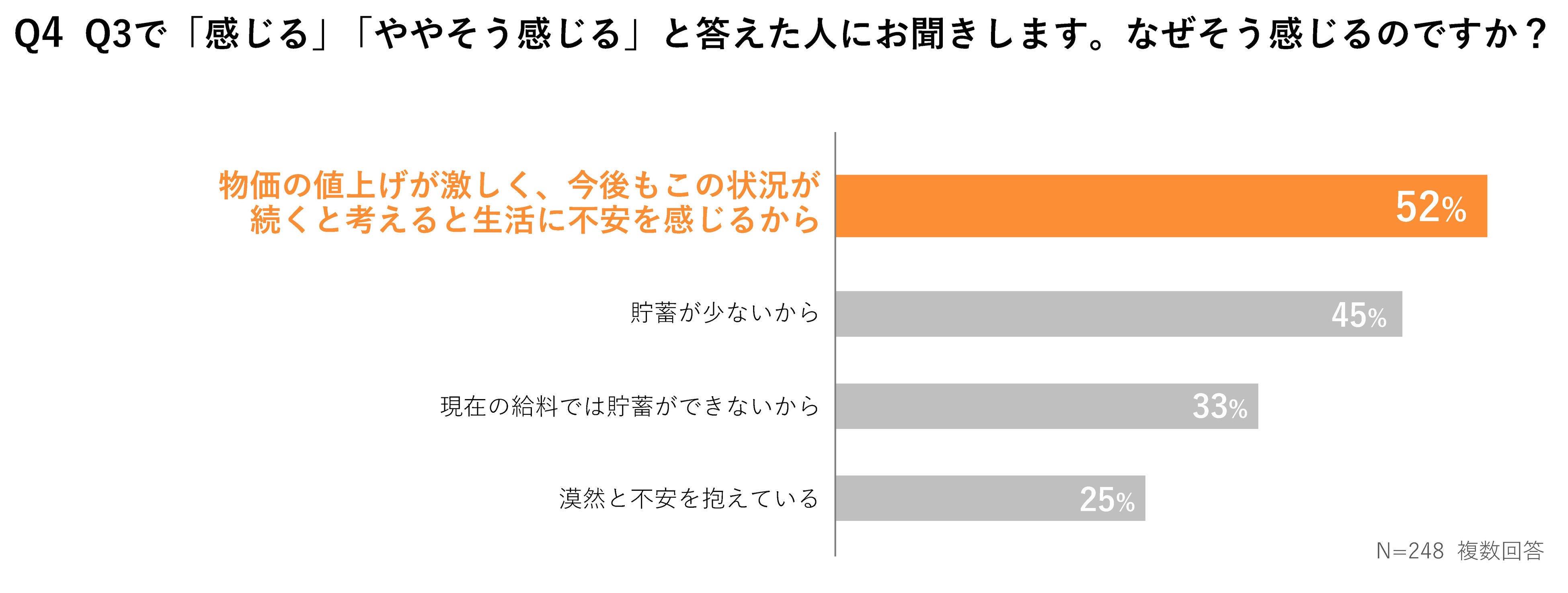 また、「感じる」、「やや感じる」と答えた人に、なぜそう感じるのか?を質問したところ、「物価の値上げが激しく、今後もこの状況が続くと考えると生活に不安を感じるから」と回答した人が最も多い結果となりました。次いで「貯蓄がないから」、「現在の給与では貯蓄ができないから」といった将来の蓄えについての不安が続きました。