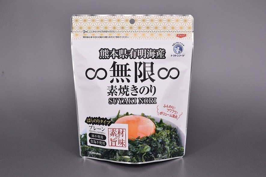 「∞無限∞のりシリーズ」は、トリトンフーヅが展開する、無限に食べられるほど飽きない美味しさのばらのりシリーズです。以前より販売している味付けタイプの「∞無限∞やみつきのり」はトリトンフーヅの中でも人気の高い商品です。