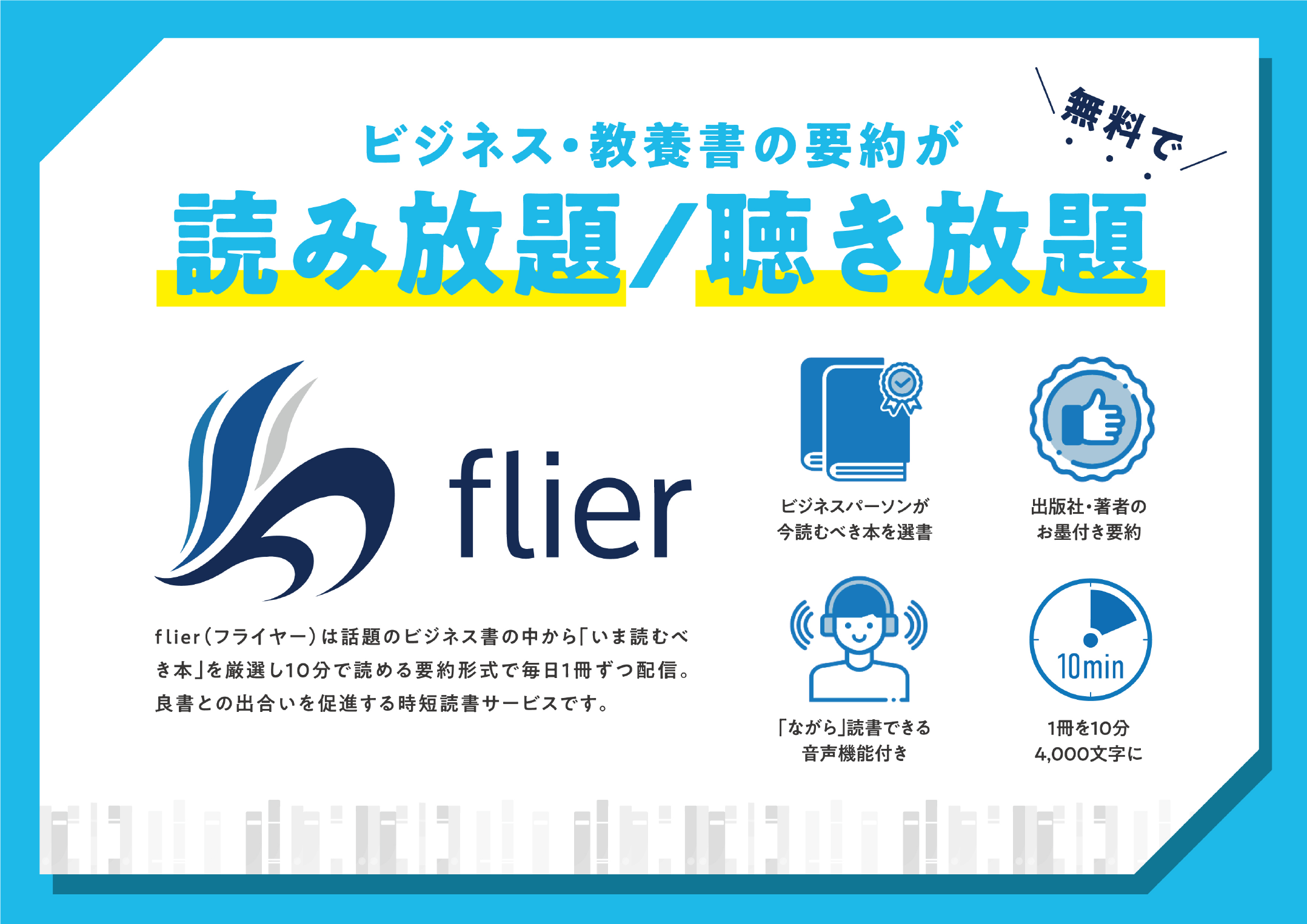 株式会社フライヤーは、本の要約サービス「flier(フライヤー)」を運営する、ITベンチャー(2013年6月設立)で、ビジネス書の新刊や話題のベストセラー、名著の要約を1冊10分で読める形で提供しています。通勤時や休憩時間といったスキマ時間を有効活用し、効率良くビジネスのヒントやスキル、教養を身につけたいビジネスパーソンに利用されてきました。10分から取り組むことができるため、「自ら学ぶきっかけ」としても「習慣化への第一歩」としてもご好評いただいています。