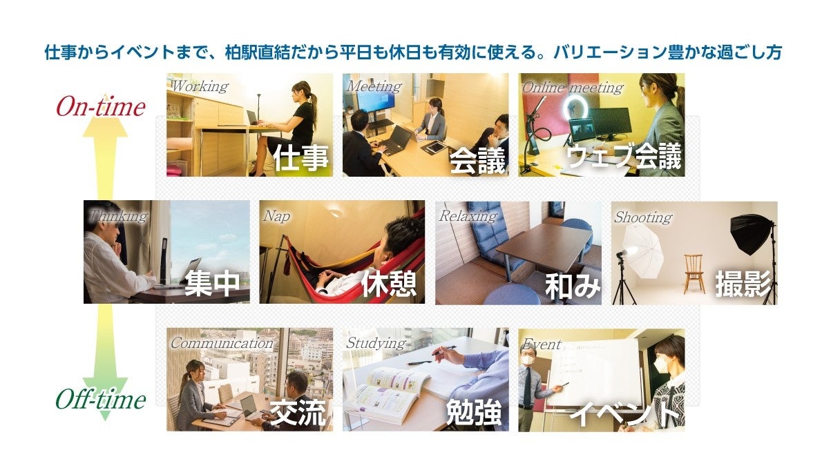 「Kashiwa grand~シェアオフィス&コワーキングスペース~」は、ニューノーマルなワークスタイル&ライフスタイルを可能にする場所をコンセプトとし、これまで都心へと通勤していたキャリア層のテレワークスペースとして、地元柏をビジネスで盛り上げるフリーランスのためのシェアオフィスとして、また柏髙島屋ステーションモールへお買い物にお越し頂く方々を中心に、ご利用者の皆様それぞれのワークライフバランスの実現に向けた取り組みを実施しております。