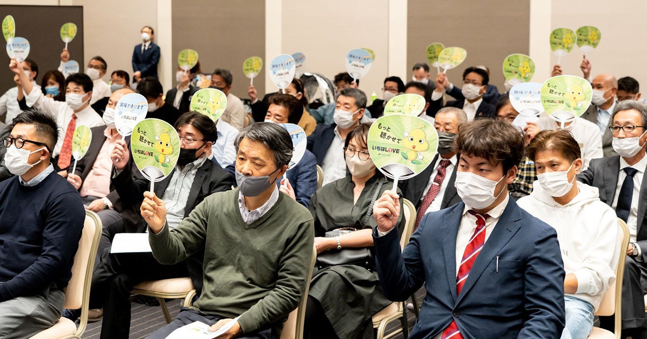 約3カ月のプロジェクトの集大成となったのが「ビジネスオーディション」。各社8分の持ち時間でプレゼンを行い、会場の来場者約50人がプレゼン内容やパフォーマンスを審査しました。審査には「興味があります」、「もっと聴かせて」が表裏に書かれた「うちわ」を使い、それぞれ1点、2点が入る形で採点しました。
