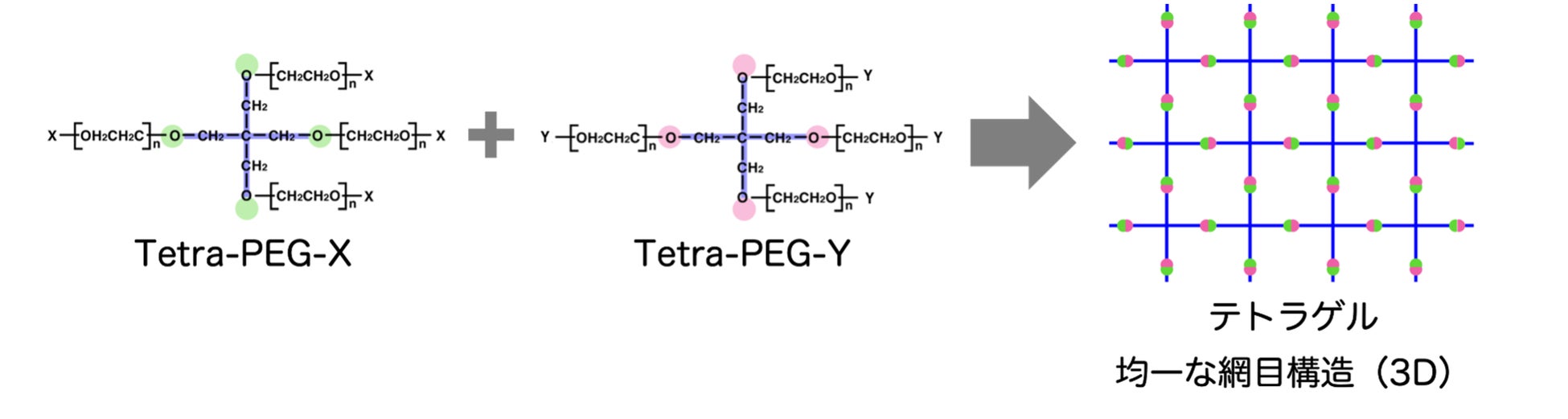 テトラゲル技術とは東京大学工学部の酒井崇匡教授が生み出した新しいゲル技術です。4分岐構造を持ち、お互いに反応する異なる末端を持つ2種類のポリマーを混ぜ合わせる事により、均一な網目構造を持ったゲルを作成することが可能です。