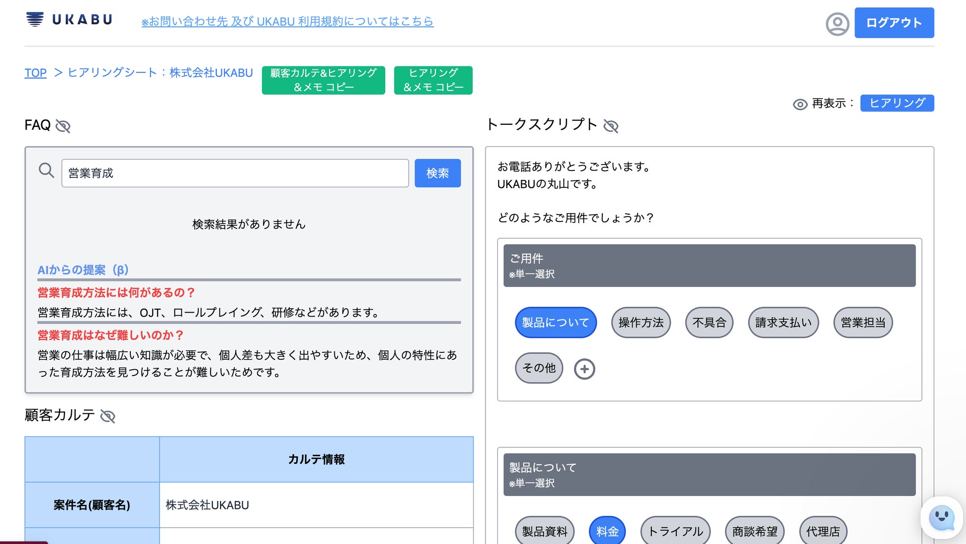営業と顧客のコミュニケーションをサポートするツールです。覚えていなくても、思い浮かばなくても、電話や商談の流れに合わせて、次に話すスクリプトや質問がリアルタイムに変わるUKABU。UKABUをみながら、話せるようにすることで、新人営業の早期戦力化や、営業準備などの営業の業務効率向上を支援します。営業先の「顧客名」と「会話目的」を入力するだけで、営業時に整理しておきたい顧客情報を各種データベースやWEBから自動収集し、顧客毎に合わせたヒアリングシートや、リアルタイムに切り替わる営業スクリプト、FAQが自動作成されます。