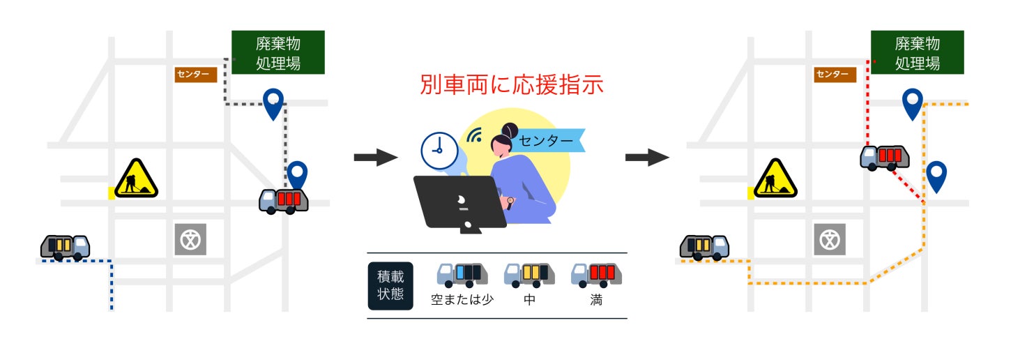 塵芥車は、家庭や事業所から出るさまざまな廃棄物を収集するために、あらかじめ決められたルートを走行しています。しかしながら、廃棄物の量や交通事情などは、各ルートや収集日・時間帯によって異なるため、急なルート変更や車両の応援手配が必要になるほか、効率よく収集を行うには、ドライバーとオペレーター双方の長年の経験やノウハウが必要で、かつ、これらの情報は主に電話が連絡手段となっていました。