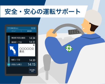 位置情報を活用し、塵芥車に特化したルート案内(収集場所や到着予定時刻の案内等)を行います。運転席近くに設置したナビゲーション画面に、単なる最短コースではなく、通学時間・渋滞・危険地帯回避を考慮した最適なルートを表示させることで、だれもが安心して運転・収集業務ができる環境を提供します。また、効率的な運行により、燃費向上・CO2排出量削減にも貢献します。