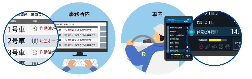 車両の稼働状況を収集することにより、各車両・ルートの作業負荷の見える化や業務日報の自動作成、塵芥車ごとに適切なメンテナンス時期をお知らせします。