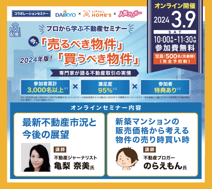 【3/9(土)10時】2024年版!今、「売るべき物件」「買うべき物件」~専門家が語る不動産取引の実情~プロから学ぶ不動産セミナー開催(無料オンラインセミナー)