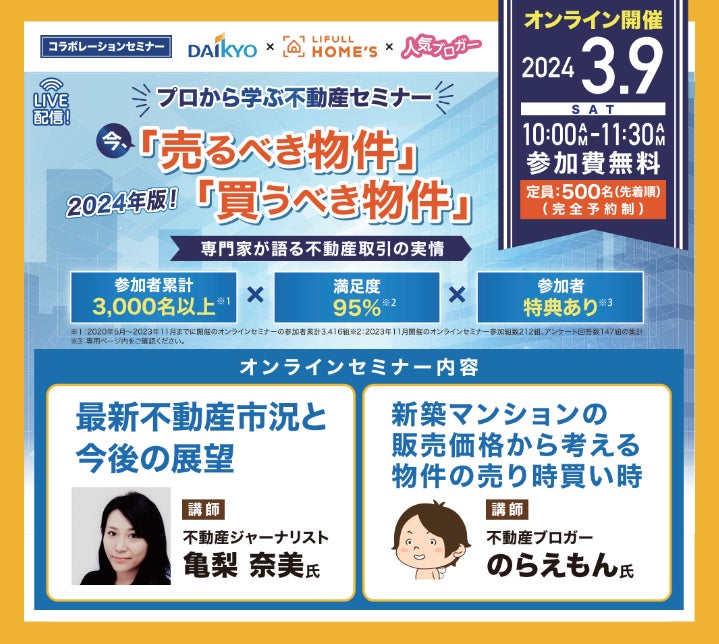 累計“3,000名以上”の方に参加いただいた大京穴吹不動産&ライフルホームズコラボレーションセミナーを開催〜不動産専門家、人気不動産ブロガーが直近の不動産トレンドを徹底解説〜
