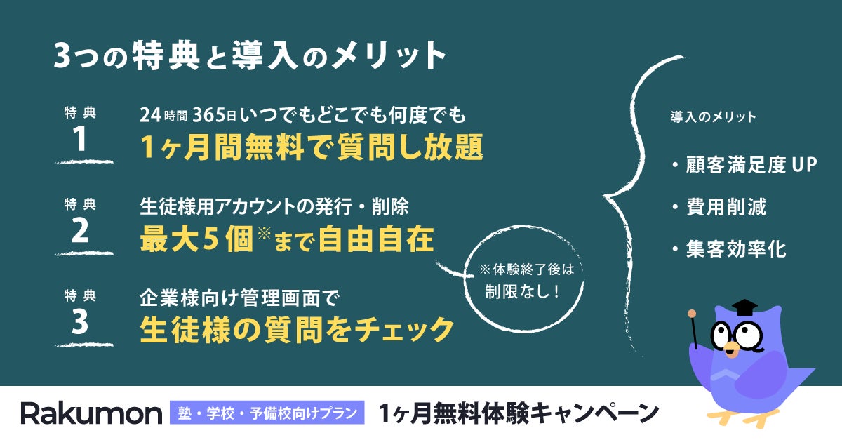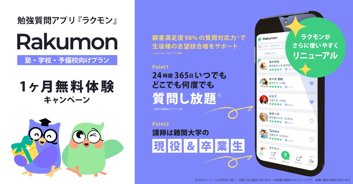 勉強質問アプリRakumon【塾・学校・予備校向けプラン】が1ヶ月無料体験開始!質問し放題で生徒様の志望校合格をサポート!!