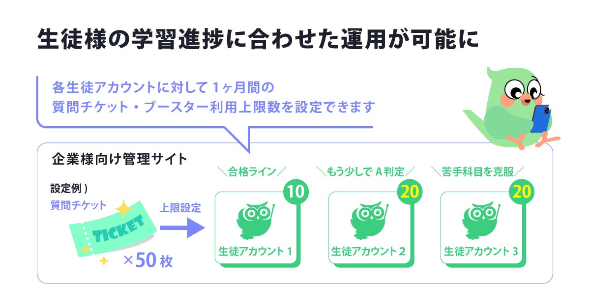 企業様が管理できる新機能として、生徒用アカウントごとに使用できる「質問チケット」や「おしおしブースター」の上限数を設定することが可能になりました。これにより、各生徒の学習進捗に応じた最適なサポートが提供できるだけでなく、利用バランスを保つことができます。柔軟な設定で、学校や塾の運営方針に合わせたカスタマイズが可能です。