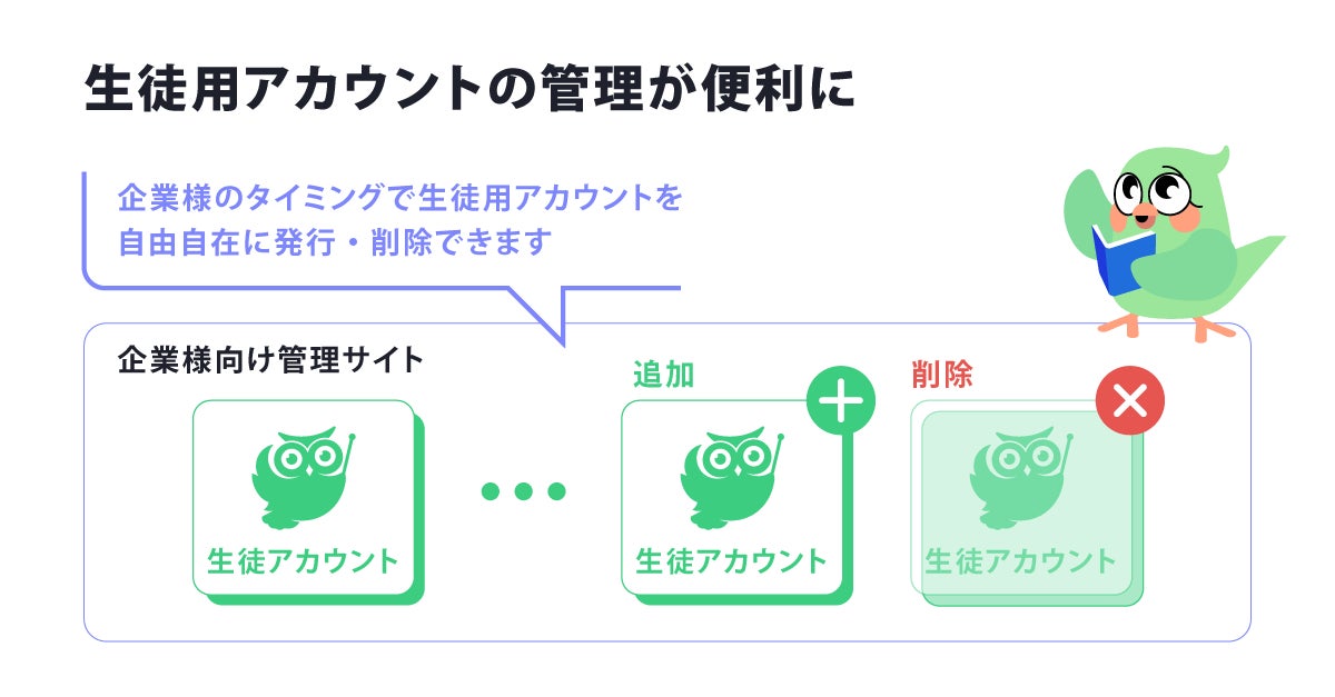 今回のリニューアルにより、企業様は自社で生徒様のアカウントの発行や削除が可能になりました。これにより、迅速にアカウント管理ができ、生徒様の利用状況に応じた柔軟な対応が簡単に行えます。さらに、今ならアカウント発行手数料が無料となっているため、導入コストを大幅に削減することができます。