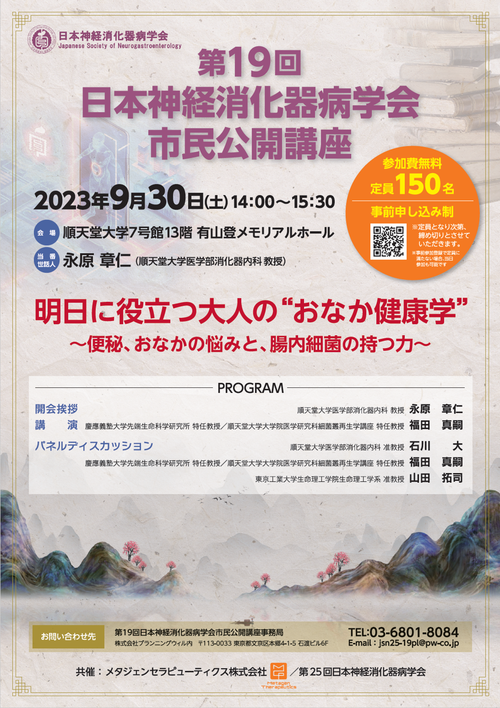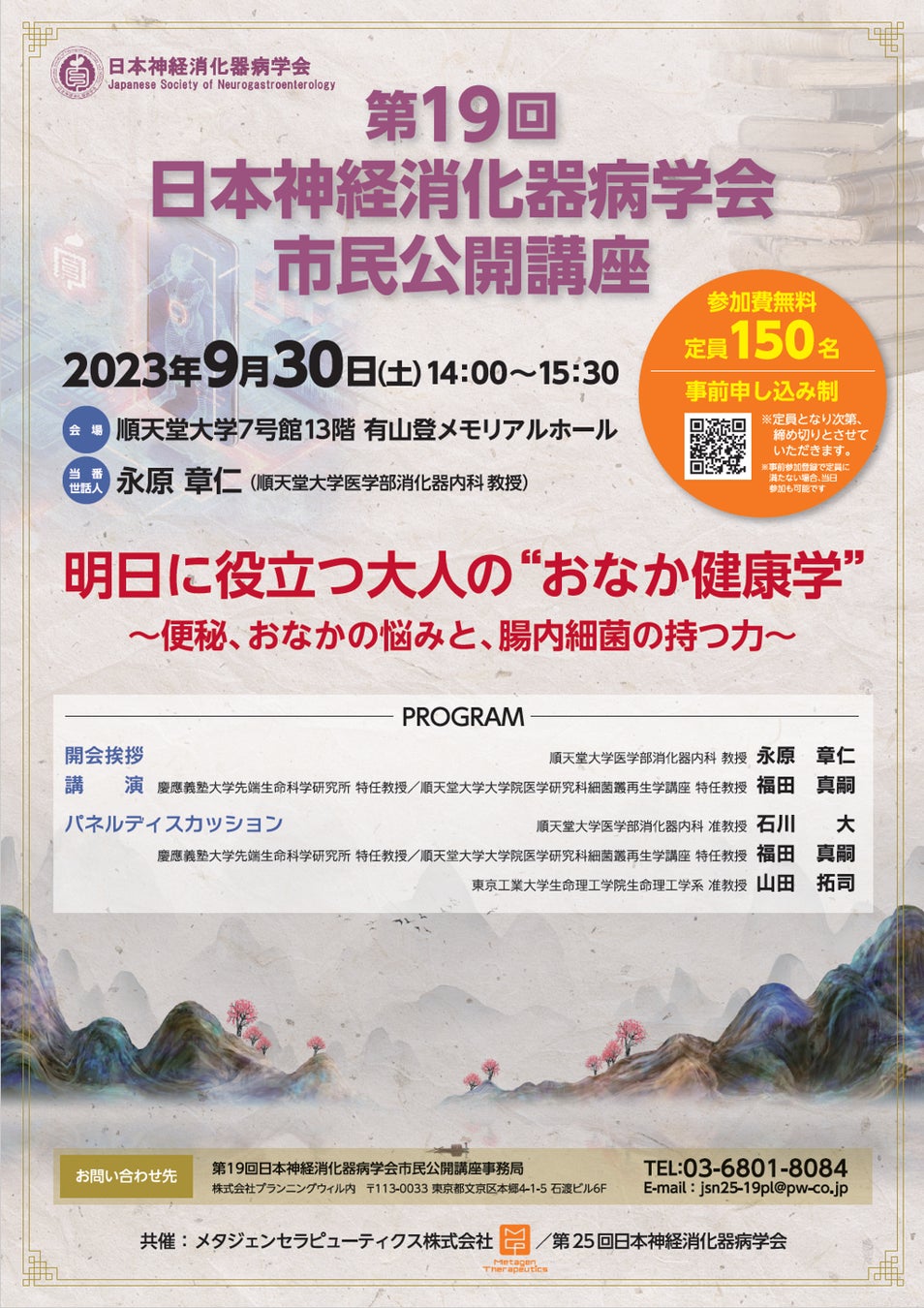 腸内細菌研究に基づいた医療・創薬を推進するメタジェンセラピューティクス株式会社(本社:山形県鶴岡市、代表取締役社長CEO:中原拓)は、日本神経消化器病学会との共催で、2023年9月30日(土)、一般の方を対象に市民公開講座「明日に役立つ大人の”おなか健康学” ~便秘、おなかの悩みと、腸内細菌の持つ力~(https://www.pw-co.jp/jsn25/public_lecture.html )」を開催します。