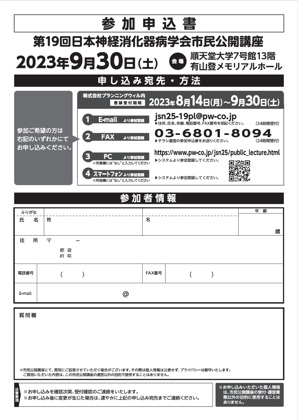 ※お申込みいただいた個人情報は、市民公開講座の受付・運営業務以外の目的に使用することはありません。