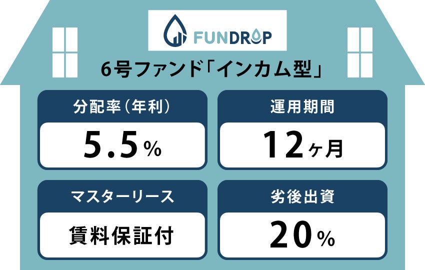 ONE DROP INVESTMENT株式会社(本社:東京都港区、代表取締役:井筒秀樹、以下「当社」)が運営する不動産クラウドファンディングサービス「FUNDROP」は、2023年3月24日(金)、「6号ファンド」(以下「本ファンド」)の償還および年利5.5%の分配を完了しましたことをお知らせ致します。尚、本ファンドは2023年3月23日(木)に運用を終了しております。