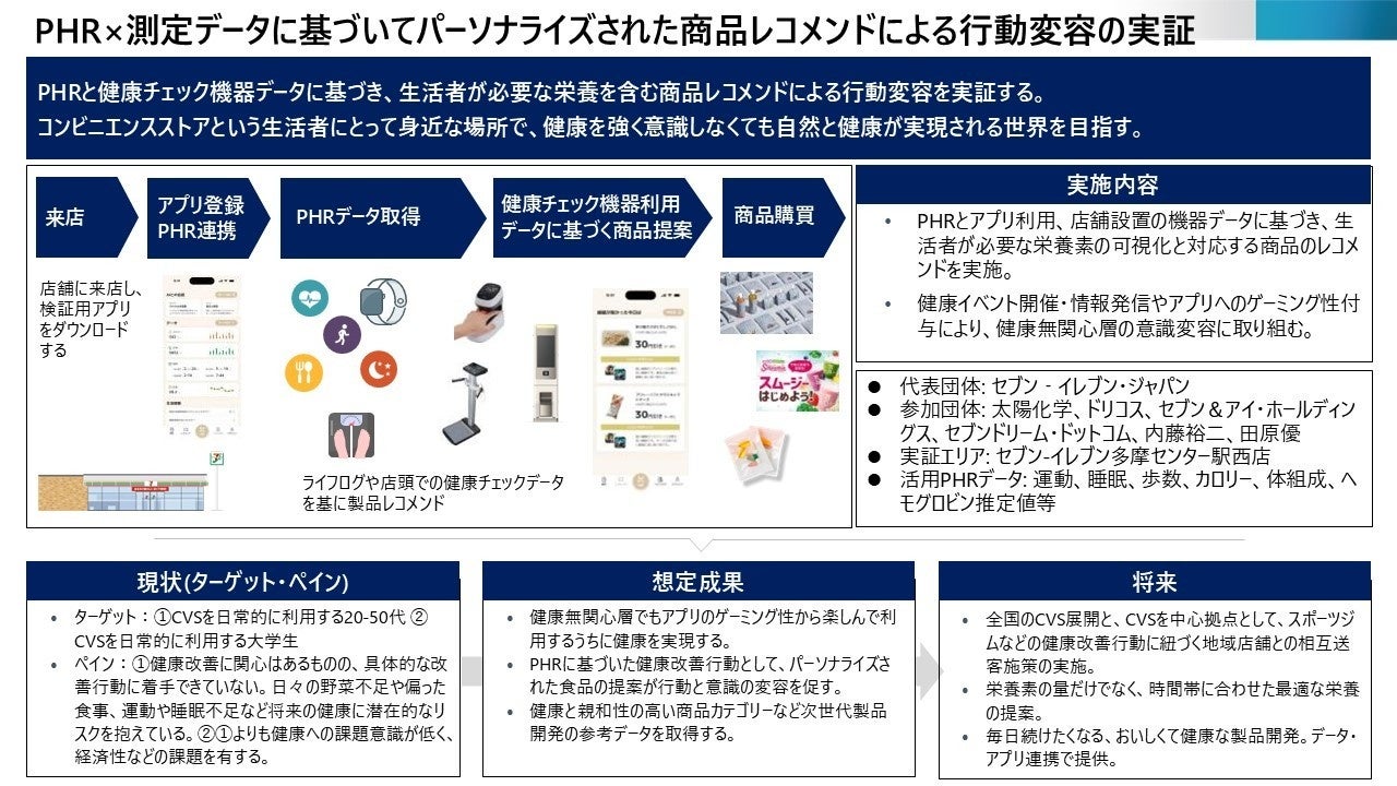 食品素材メーカーである太陽化学は、健康と栄養に関わる知見と外部専門家とのネットワークを発揮しながら、株式会社セブン-イレブン・ジャパン(以下、セブン-イレブン)、株式会社セブン&アイ・ホールディングス、株式会社セブンドリーム・ドットコム、ドリコス株式会社とコンソーシアムを組み、コンビニエンスストアを日常使いする中で「いつの間にか健康」の実現に向けた実証事業に取り組みました。
