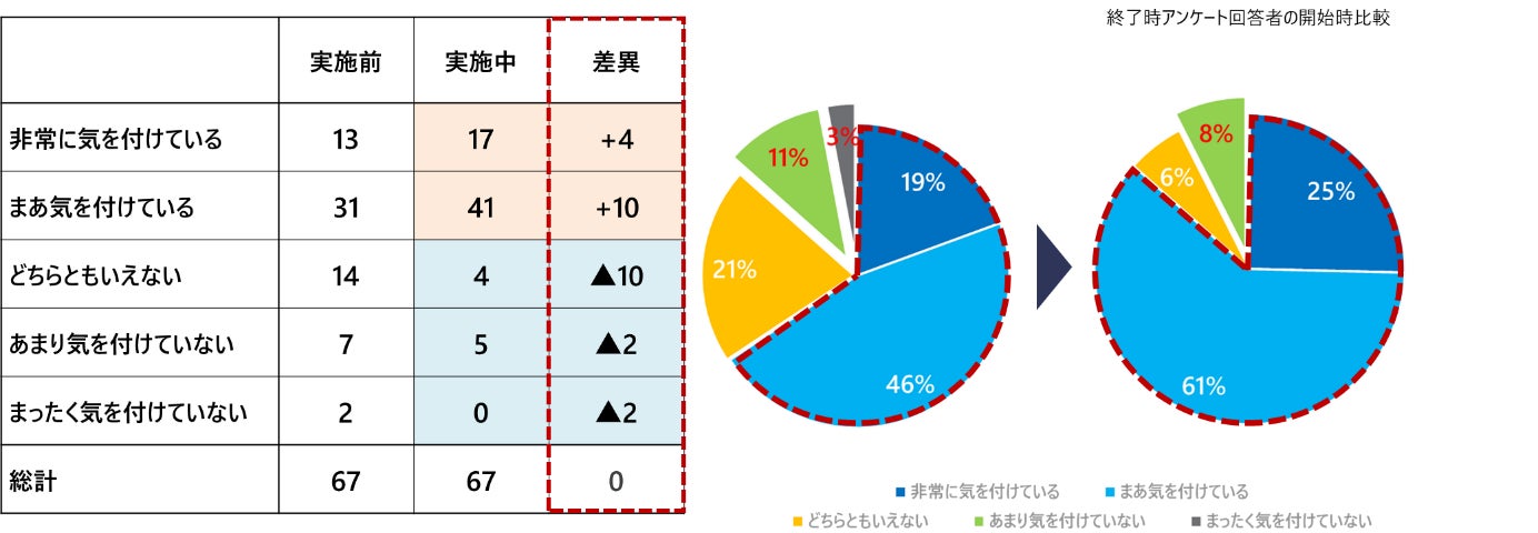 アプリをダウンロードして取り組みに参加した時点の健康意識と、終了時のアンケートを比較したところ、本取り組みによって健康に対する意識が高まる結果が示されました。