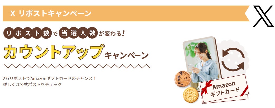 「お菓子と、わたし」公式Xアカウントでは、キャンペーン投稿をリポストするだけで参加できるプレゼントキャンペーンを実施いたします。リポスト数の増加に応じて当選人数も増える、参加者とともに盛り上がる臨場感のあるキャンペーンです。最大の2万リポストを達成すると、Amazonギフトカードがプレゼント内容に追加されます。
