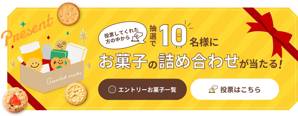 投票部門は、「オールスター部門」と「フォーカス部門」の2部門構成となっており、「オールスター部門」では「ベストオブビスケット」「ルックスデリシャス賞」「パッケージデザイン賞」の3賞を、「フォーカス部門」では「フレーバー賞」「ネクストブレイク賞」「からだにうれしい賞」の3賞を設けています。各部門のテーマに最もふさわしいと思うビスケットに投票いただき、投票にご参加いただいた方の中から抽選で10名様に、エントリービスケット32品の詰め合わせをプレゼントいたします。